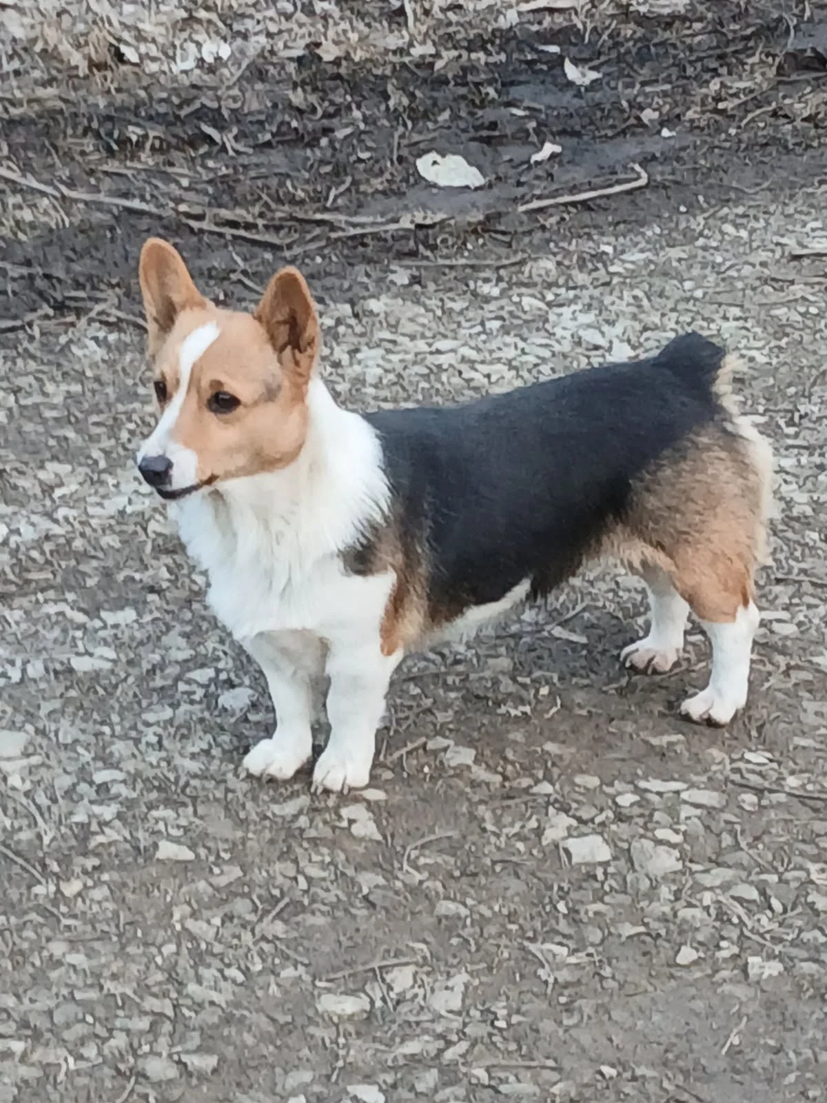 Poppy is our youngest dog. She is a tri-color AKC-registered Pembroke Welsh Corgi with lots of snowy white in her coat that somehow never seems to get dirty. Like Louis, she came to us from a larger breeding farm where she was one among many dogs and she was very wary and frightened. Part of what we love about raising dogs is rehabilitating them to a natural life and teaching them that they can trust us. Poppy, who once wouldn't even let us pet her, now follows us everywhere. She loves doing chores and feeding the horses. We're excited to see how having her first litter matures her.