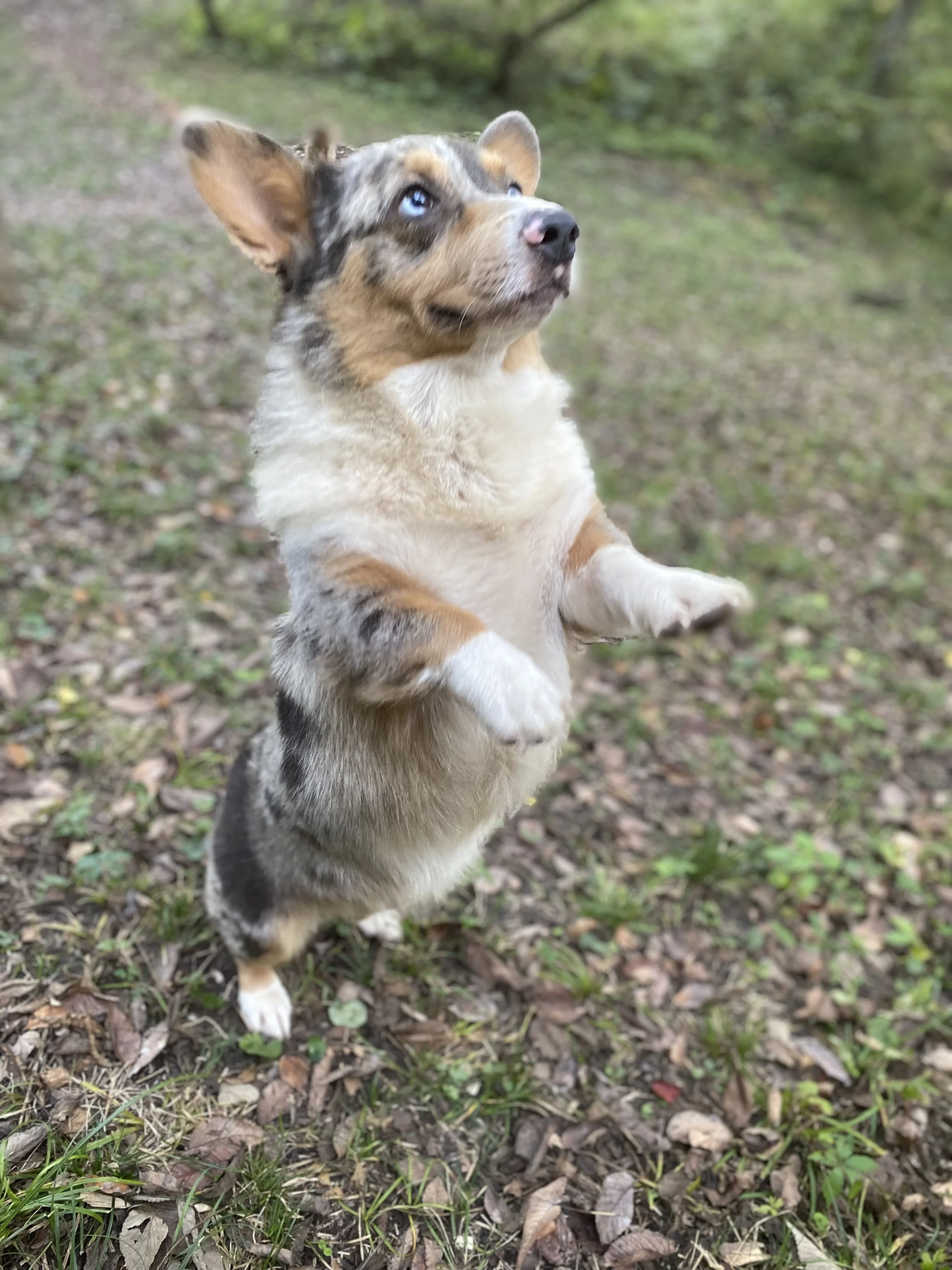Louis is our new sire, a blue merle Cardigan/Pembroke Corgi. He has blue eyes, a gorgeous mottled gray, black, tan and white coat, and the sweetest temperament ever.
